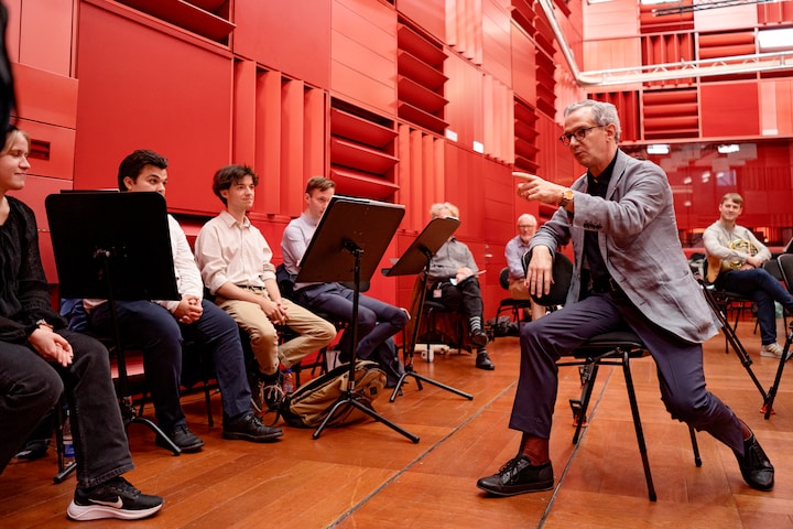 Bag musikerne i Studie 4 sad en vigtig gæst, nemlig DR Symfoniorkestrets chefdirigent Fabio Luisi, som kom for at hilse på de unge og se dem dirigere. Det er planen, at han senere på sæsonen også skal undervise de seks europæiske talenter. De seks studerende er udvalgt blandt 110 ansøgere fra 27 lande, som alle ønskede at blive en del af det nye DR-akademi. (Foto: © Agnete Schlichtkrull)2 / 7