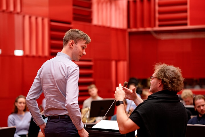 Der er meget at tænke på, når man skal dirigere et orkester. Her er det dirigenten Henrik Vagn Christensen, der giver tekniske og musikalske råd til 21-årige Gabriel Durliat fra Frankrig. (Foto: © Agnete Schlichtkrull)4 / 7
