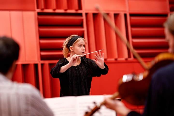 For de fleste er fredag aften nok den tid på ugen, hvor man tænker mindst på arbejde og studier. Men for seks unge musikalske talenter fra fem forskellige lande var fredag aften i sidste uge startskuddet på to års intenst studieforløb, hvor de første gang mødte op i DR som del af deres uddannelse i det nye Malko Academy for Young Conductors. 21-årige Ragnheiður Jóhannsdóttir fra Island er en af de seks unge talenter, der drømmer om at blive dirigent. Til sin første rigtige dirigenttime på Malko-akademiet dirigerede hun Beethovens 5. symfoni med et ensemble af 18 professionelle musikere i DR Koncerthusets Studie 4. (Foto: © Agnete Schlichtkrull)1 / 7