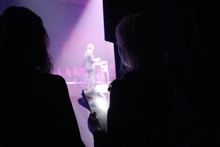 Sidsel Klostergaard følger med fra sin plads ved siden af scenen sammen med en mand, der sørger for, at talerstolen kommer på scenen på de rigtige tidspunkter, og kvinden, der skal overlevere priserne til kronprinsparret, så de kan give dem videre til prismodtagerne.