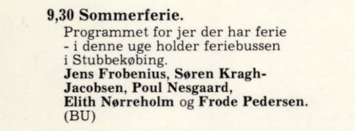 - I 1967 undrede Elith Nørreholm og jeg os over, at man sad i et kedeligt mørkt studie i København og sendte ferieprogrammer, mens landets børn jo var på ferie ude i landet. Hvorfor var DR ikke der, hvor børnene og deres forældre var – ude i ferielandet? Året efter var feriebussen en realitet. Hver uge en ny by et sted i landet. Dengang var der kun én radiokanal om formiddagen i Danmark. Så det var et tilløbsstykke, når kendingsmelodien ’Magic Trumpet’ brølede ud over havn og torv i lillebyen og konkurrerede med kirkeklokkerne. Elith Nørreholm inviterede alle til at være med - og lytte til Søren Kragh-Jacobsen og Tim Cenius, der live gav ’Sommerferie-sangen’. Eller til at se Poul Nesgaard, der jokede med de børn, han hjalp med at lave radio. Det var vigtigt for den nye B&U-afdeling, at feriebussen var børnenes sted og ikke et ’radiohus på hjul’.
