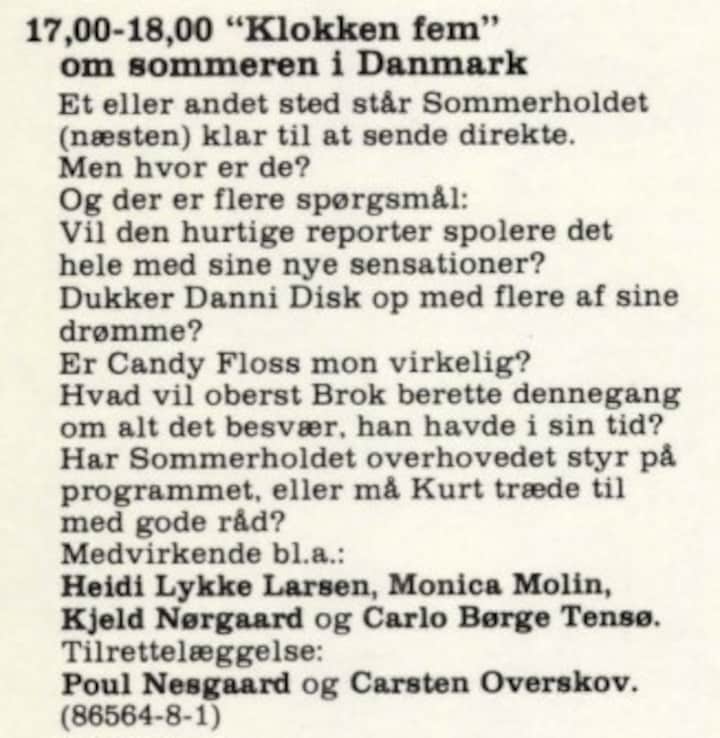 I 1979 oprettede ’Klokken fem’-teamet ’Sommerholdet’, der også rejste rundt i landet med transmission fra et nyt sted hver fredag. Man kan næsten høre Poul Nesgaards underfundige børneunivers i programteksten: - Et eller andet sted står ’Sommerholdet’ (næsten) klar til at sende direkte. Men hvor er de?”. Læs videre i programteksten: