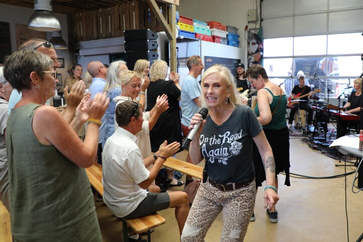 - For os er det kun sjovt, hvis vi må gøre det sammen med jer. Det er så vidunderligt, at I nu må rejse jer og synge med igen. I forstår ikke, hvor lykkelige vi er, siger Sanne Salomonsen direkte henvendt til publikum.