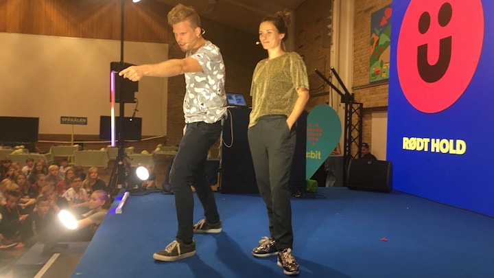 De er på scenen for at vise hele salen på Katrinebjergskolen i Aarhus, hvordan teknologi, leg og læring kan gå hånd i hånd i DR’s læringsprojekt ultra:bit.