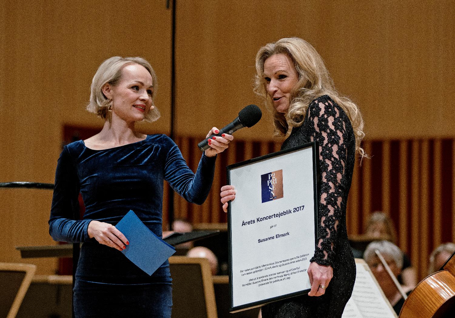 P2 Prisen ’Årets Danske Album 2017’ går til ’Let Me Tell You’ for Hans Abrahamsens isnende skønne musik for sopran og orkester, der gendigter Ofelias historie. Sopranen Barbara Hannigan tegner Ofelia som en reflekterende, sårbar og stærk figur. I symbiose med Hans Abrahamsens besjælede vinterlandskab smelter hun vores hjerter. Frugterne af deres samarbejde er et højdepunkt i dansk musikhistorie. Årets Koncertøjeblik 2017 P2 Prisen ’Årets Koncertøjeblik 2017’ går til Susanne Elmark for rollen som Marie i Bernd Alois Zimmermanns opera ’Die Soldaten’ i en række opførelser i Zürich, Berlin og Buenos Aires siden 2013. Med et brændende scenisk nærvær og virtuositet formidler Susanne Elmark den martrede Marie, så hun fremstår lyslevende for publikum af i dag.