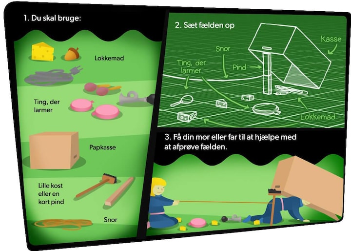 Tegn fælden Planlæg, hvordan fælden kommer til at se ud. Lav eventuel en tegning at gå ud fra. Brug ting, I har i huset til at bygge fælden. Afprøv fælden Lad barnet fange monstret. Sørg for ikke at virke skræmmende, hvis det er dig som forælder, der leger monster. Lad barnet kilde, jagte eller grine sammen med dig udklædt som monster. God fornøjelse med at fange og uskadeliggøre uhyggelige monstre!