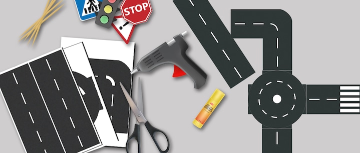 Når I har printet PDF'en nederst i artiklen, skal I klippe veje og skilte ud. Derefter limer i skiltene på tandstikkerne. Sæt nu vejene sammen på de måder, I vil på papstykket og lim dem fast. Til sidst kan I stikke vejeskiltene ned i papstykket, så de sidder fast.
