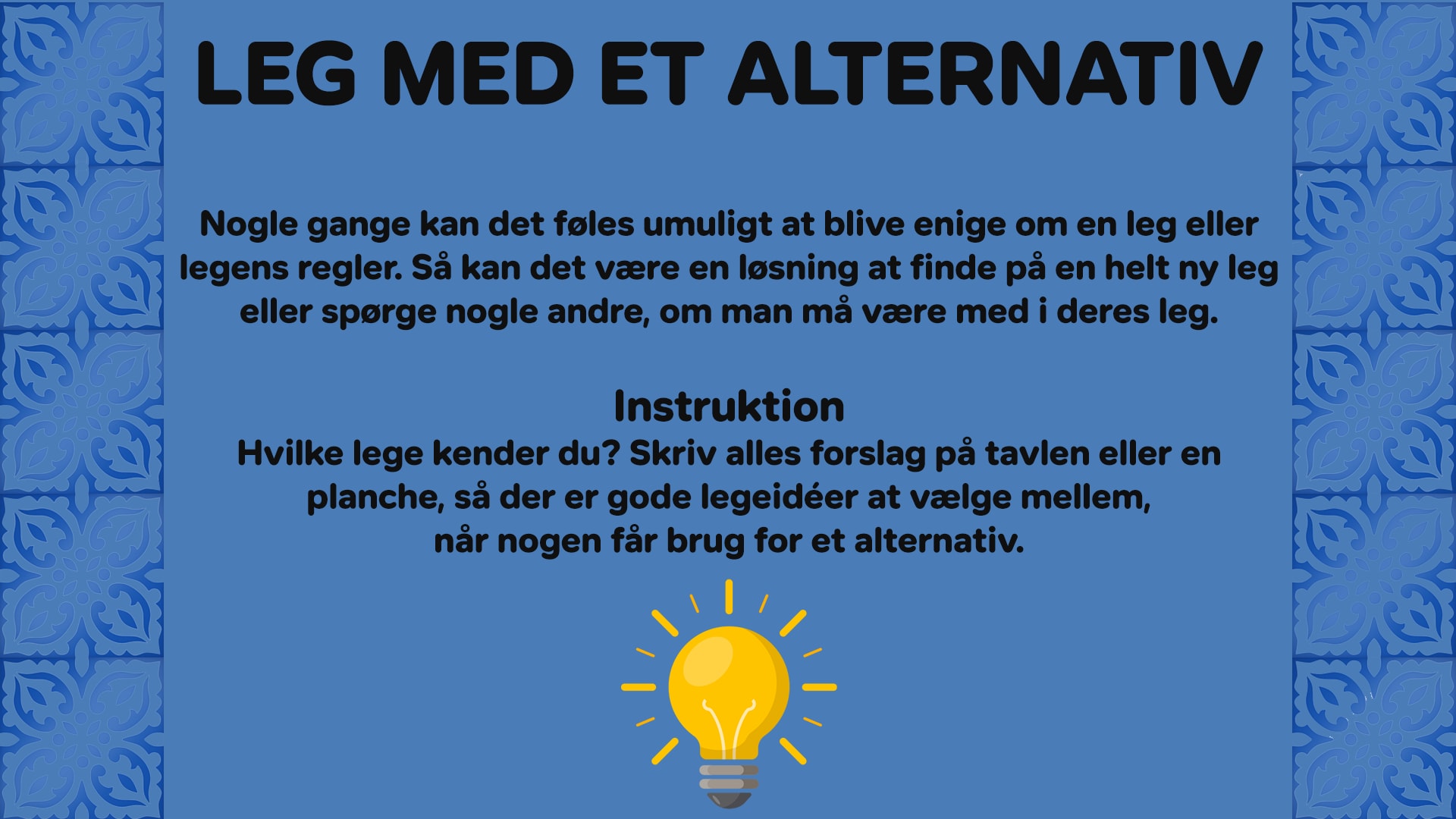 Med plakaten kan man øve sig i at finde en løsning på de konflikter, der kan opstå, når man skal finde på en leg eller legens regler under børnestyret leg.