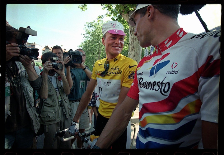 Trådet er velkendt, og det er det store, brede smil også. Gul cykelhjelm og en trikot i blå nuancer. På et tidspunkt glider tungen ud over læberne, og Bjarne Riis ser tilfreds ud.