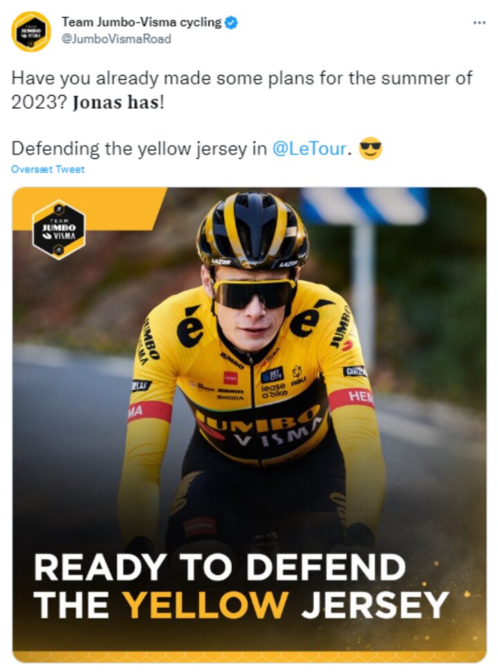 - Vi fandt ud af, hvordan vi skulle besejre Pogacar sidste år. Vi kender hans styrker og de områder, hvor Jonas er ham overlegen. Vi vender tilbage til Touren med en solid plan, og vi tror på, at vi kan sigte mod gult igen med Jonas, sagde Zeeman ved torsdagens holdpræsentation.