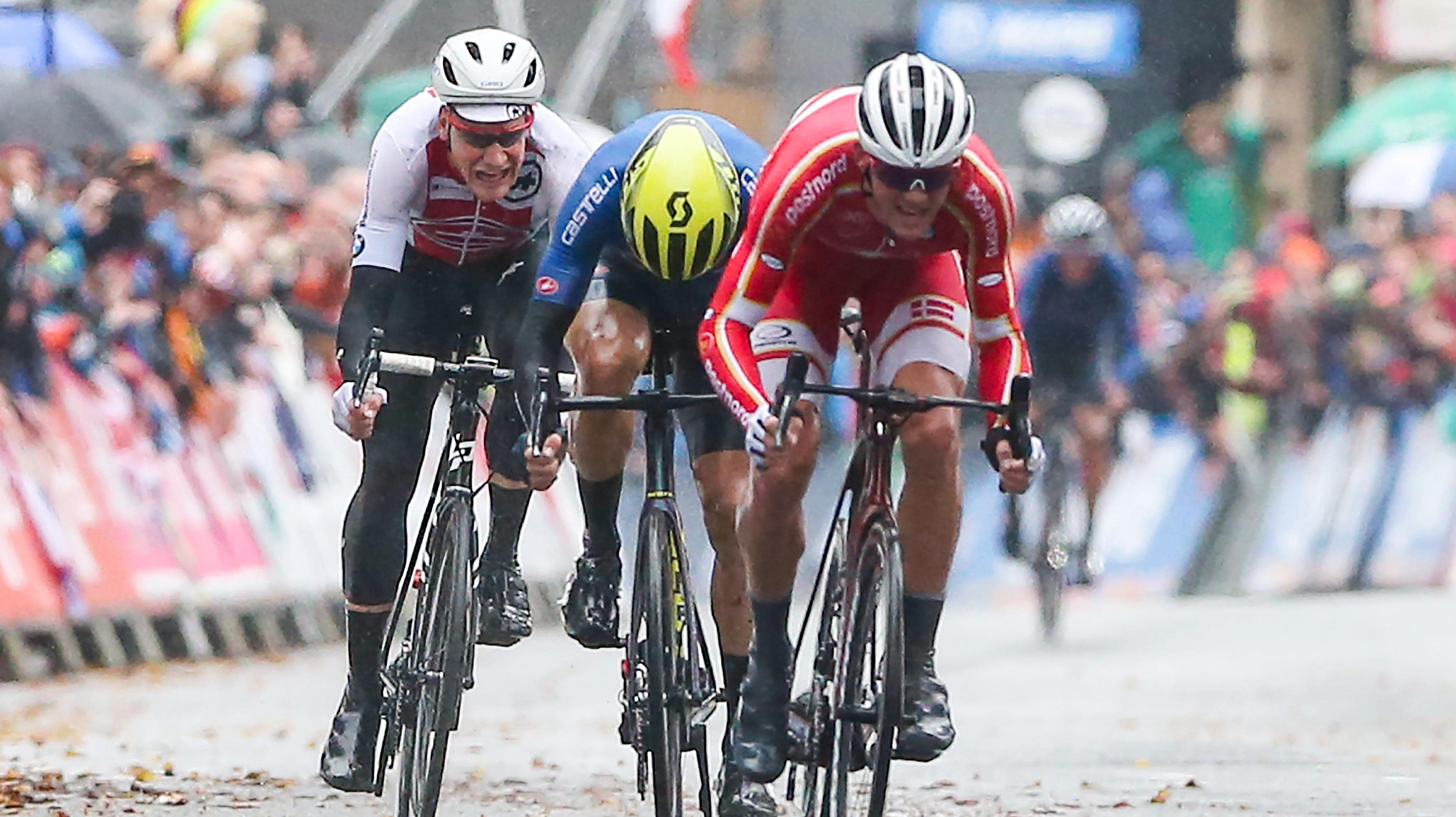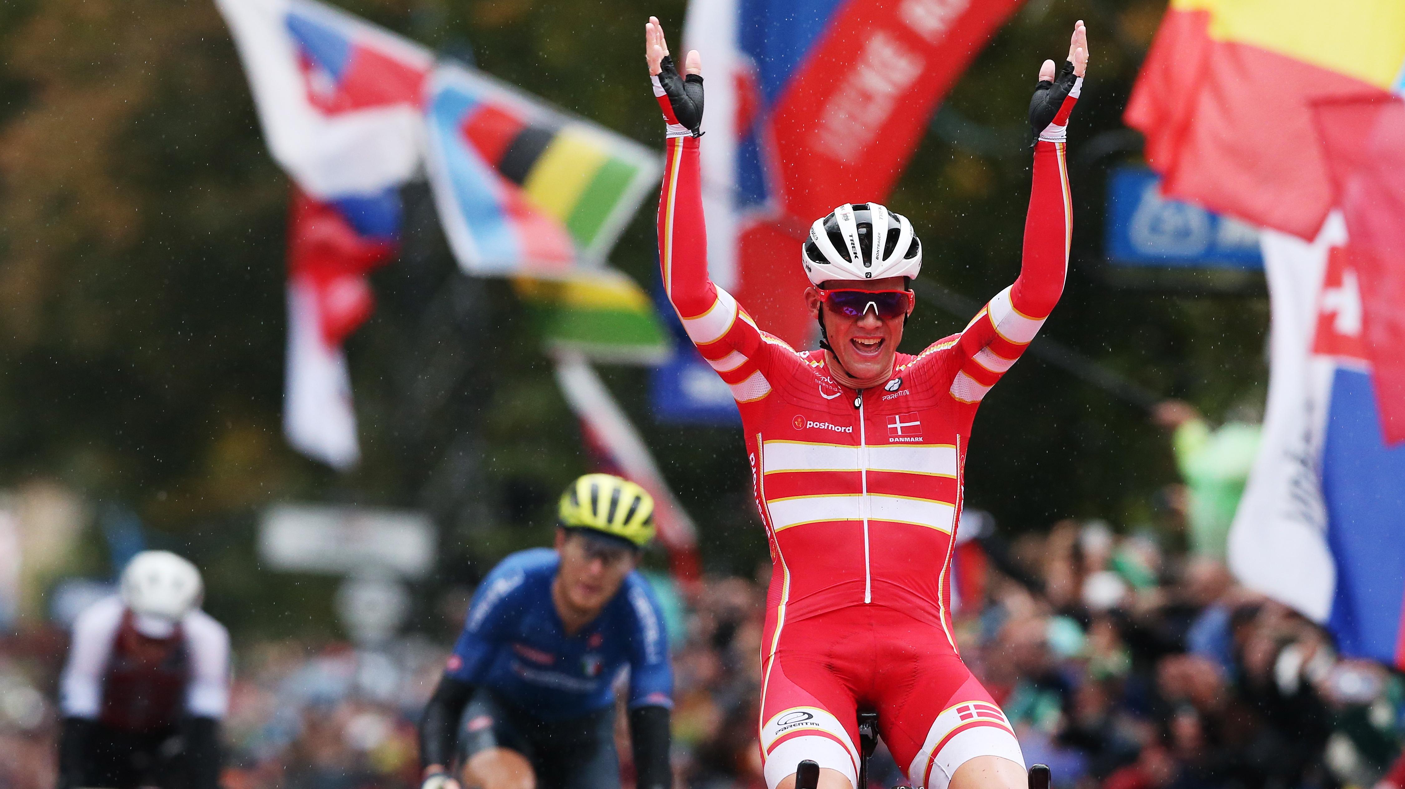 På en barsk, regnfuld og kold dag over 261 kilometer tog danskeren guldet foran italienske Matteo Trentin og schweizeren Stefan Küng.