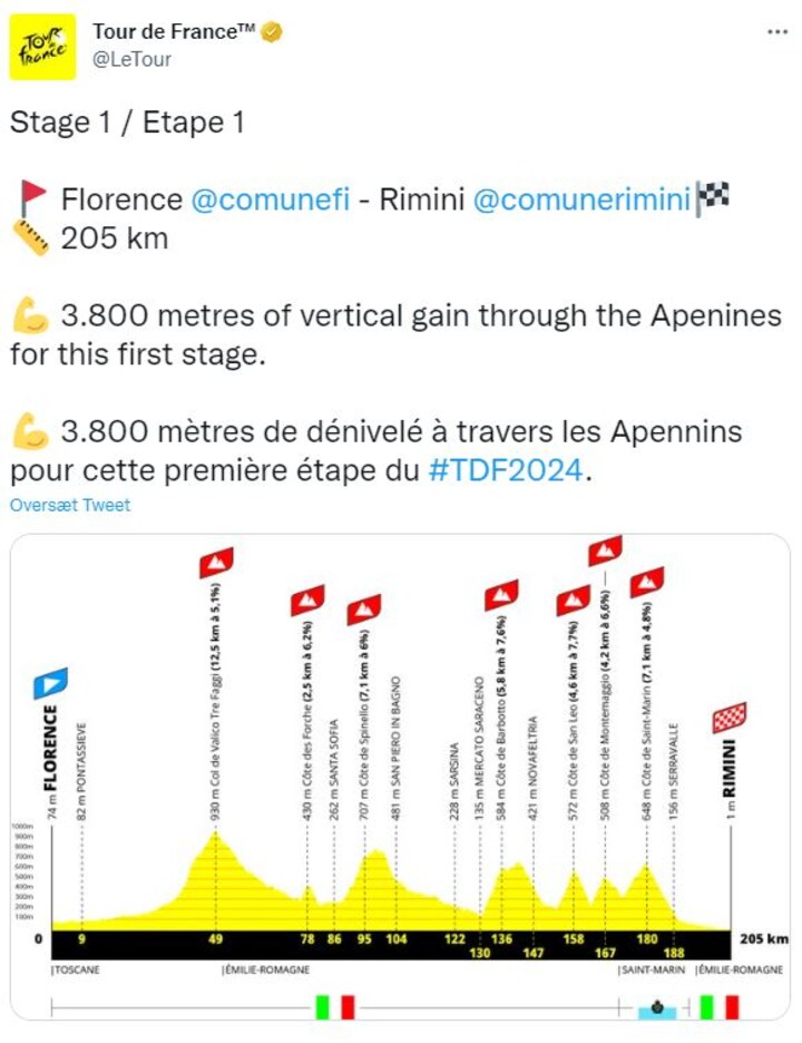 I de første etaper af verdens hårdeste cykelløb anno 2024 skal Jonas Vingegaard og kompagni nemlig klatre op over stigningerne i bjergkæden Appenninerne, fortalte løbsdirektør Christian Proudhomme til præsentationen af Tour de France-starten onsdag aften.