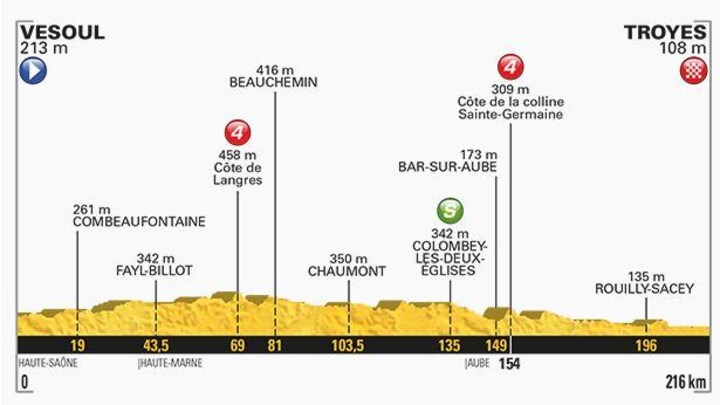 Dagens højeste punkt rammes, når feltet kører hen over kategori 4-stigningen Côte de Langres, der er 458 meter høj og har en gennemsnitlig stigningsprocent på 6,3.