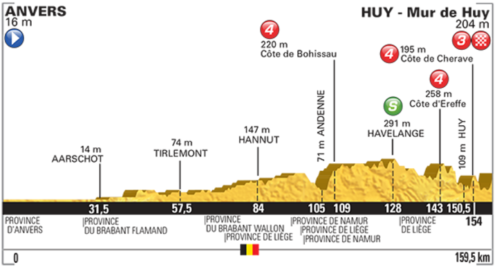 For efter 112 års ventetid debuterer den legendariske bakke Mur de Huy omsider i Tour de France, når feltet i dag skifter Holland ud med Belgien. Siden 1983 har forårsløbet Flèche Wallone haft mål på stigningen, der tårner sig op fra centrum af Huy. På grund af den exceptionelle stejle stigningsprocent (op mod 26 %) er den blevet et årlig udflugtsmål for cykelelskere.