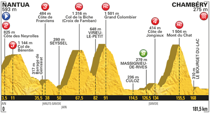 Det er kun anden gang i Tour-historien, at Mont du Chat er med i løbet. Første gang var i 1974, hvor det blev til en duel mellem Eddy Merckx og Raymond Poulidor.