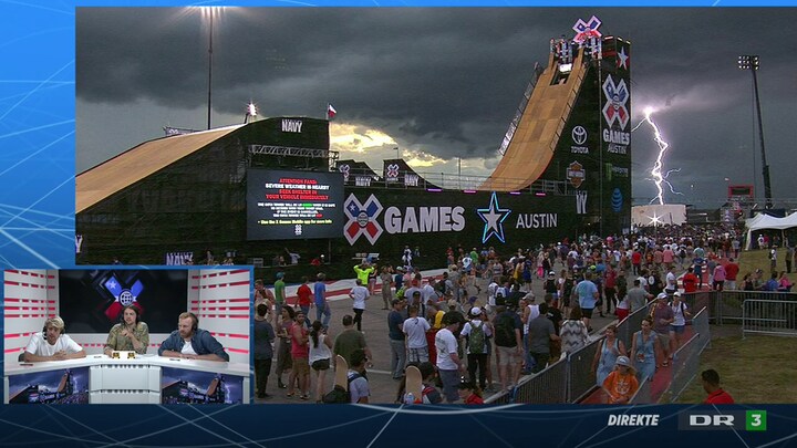 Tunge skyer hænger over X Games i Austin, og har dermed udsat Big Air Skate-finalen, da regn og lyn gør det farligt at bruge den enorme rampe.