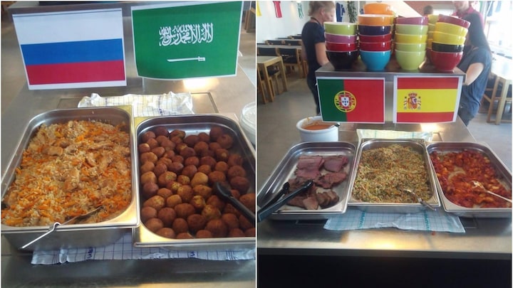Torsdag stod den eksempelvis på den klassiske kombination af falafel og plov (en russisk kød- og risret) i anledning af åbningskampen mellem Rusland og Saudi Arabien.
