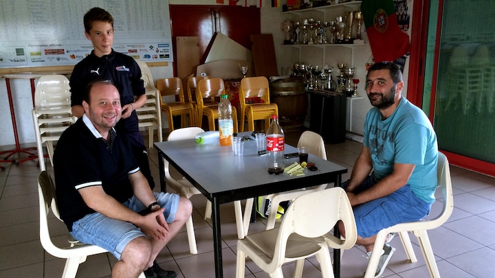 Førsteholdstræner for Union Football Maconnais, Jay Frederic, sidder ved bordet sammen med et par forældre til fodboldspillende børn i klubben. Og emnet er naturligvis EM og klubbens tidligere spiller.