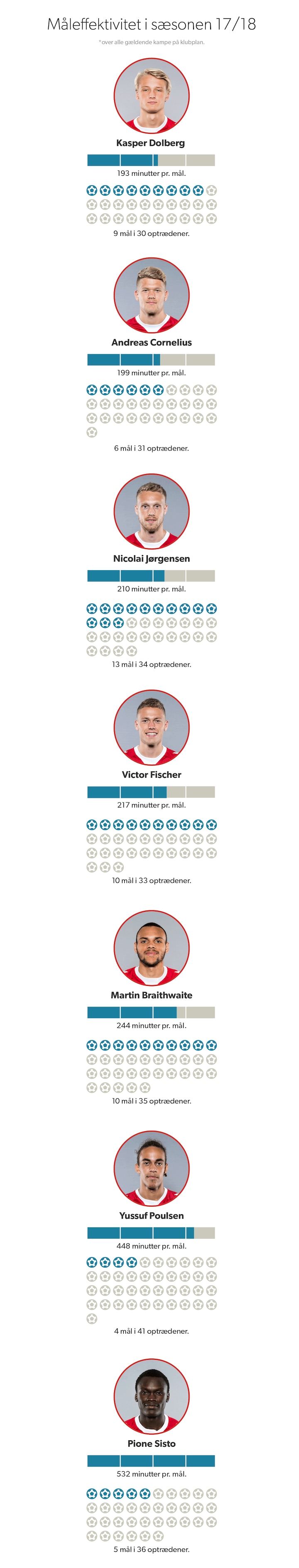 Kasper Dolberg har været anset som den største overraskelse i VM-truppen. Han har haft en skuffende sæson i Ajax, hvor han har mistet sin startplads i angrebet. Men hvis man ser på, hvor mange minutter landsholdsspillerne skal bruge på at score, klarer Dolberg sig bedst.