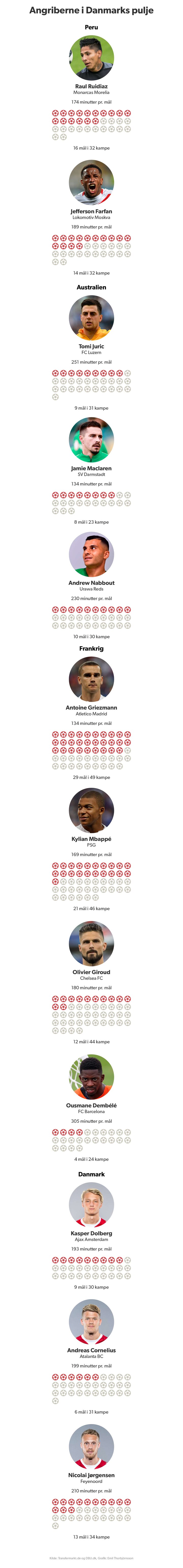 Men på klubplan halter de danske spidser lidt efter i forhold til vores modstandere. Kasper Dolberg er den, der er mest effektiv, når han kommer på banen for Ajax, hvor han skal bruge 193 minutter om at score. Det er dog noget mere end Griezmann og Jamie Maclarens 134 minutter.