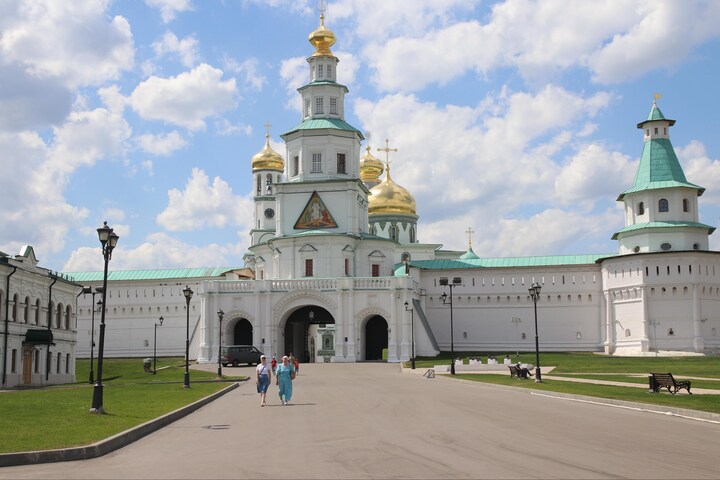 Et imponerende syn af kirker, kapeller og monumenter omkranset af en mur; et forhøjet bygningskompleks, der overkigger byen og floden Istra som et vartegn for den russisk-ortodokse kirke.