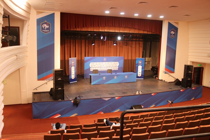 Pressemøderne foregår i noget, der minder om en koncertsal med plads til flere hundreder af tilhørere, spillerne sidder ved et podium på en dyb og bred scene, som er et semipopulært orkester værdigt, og alt bliver sendt live til Frankrig, mens fransk kaffe og franske aviser er tilgængelige for alle.