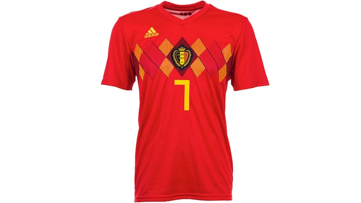 - Belgien har den her meget smukke og enkle postkasserøde trøje, som er virkelig smuk og virkelig smukt lavet. Det ødelægger de så fuldstændigt med en stribe af skaktern henover brystet i gullige nuancer med striber i.