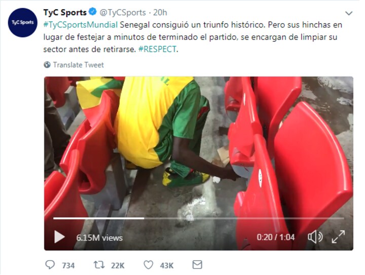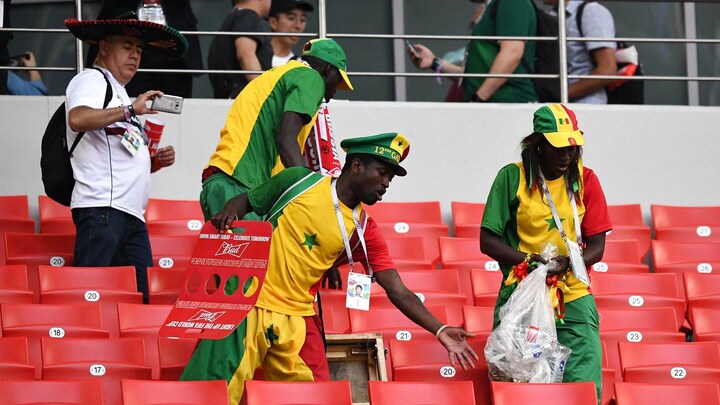 Lignende scener udspillede sig efter gårsdagens opgør mellem Polen og Senegal, hvor sidstnævnte vandt 2-1. Videoen viser, de senegalesiske tilskuere gå mellem sæderne for at samle skrald op.