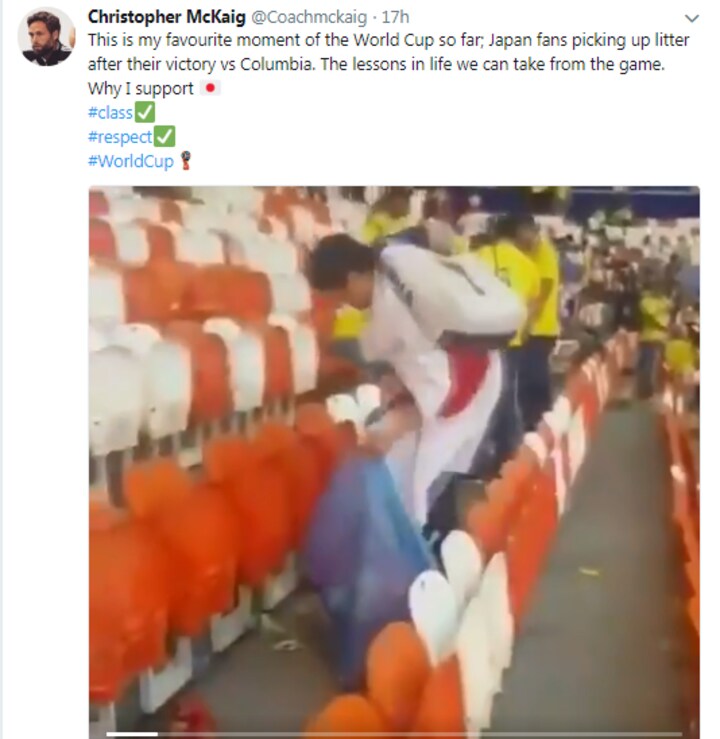 Det viser en video på det sociale medie Twitter, hvor man ser flere blå-hvide tilskuere gå rundt med poser for at samle plastickrus, pap og andet skrald efterladt af andre tilskuere efter at have vundet 2-1 over Colombia.