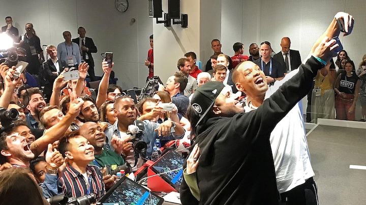 Ved pressemødets afslutning hev Will Smith sin telefon op af lommen. Han ville lige have en selfie med alle journalisterne i baggrunden – og det fik han.