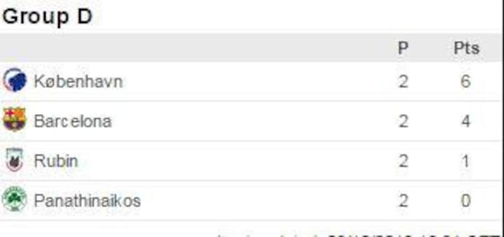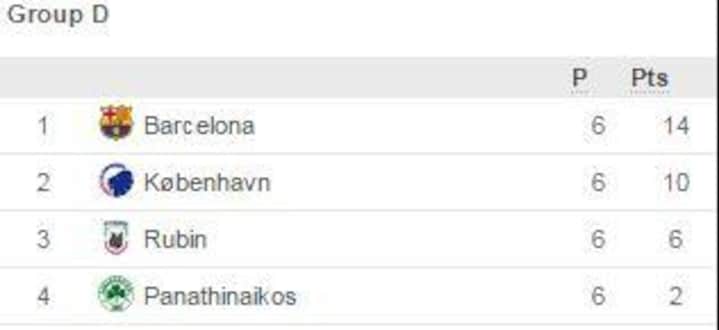 Topkamp i gruppen. Selv om Barcelona kørte rundt med FCK’erne, så var københavnerne godt med, spillede klogt og var farlige på kontraangreb. Messi scorede begge mål, men målet til 2-0 kom først i overtiden. Hæderlig indsats af FCK, der endda viste frækhed, da Kvist fra midterlinjen forsøgte at lobbe bolden over Barca-keeperen og var tæt på at lykkes. Efter nederlaget var FCK nummer to i gruppen.