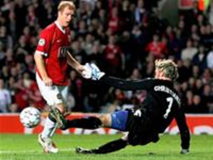 Jesper Christiansen kunne dog ikke gøre meget, da hans syn var blokeret, da Paul Scholes gjorde det til 1-0 med et skud fra kanten af feltet - godt fem minutter før pausen.