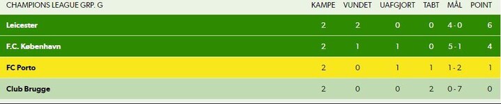 Med den historisk store CL-sejr er FCK nu på andenpladsen i gruppen med fire point, mens Leicester topper gruppen med maksimumpoint.