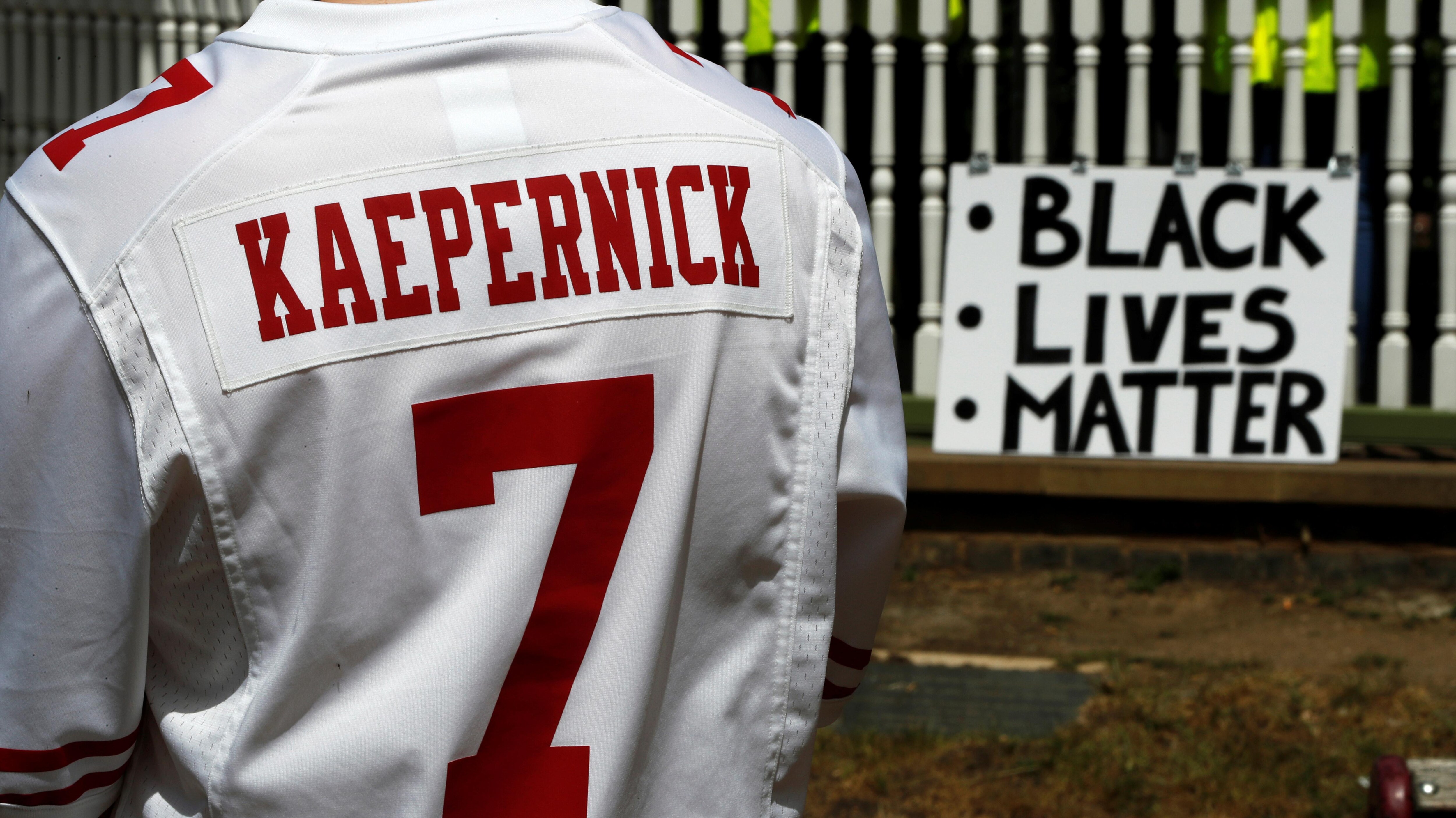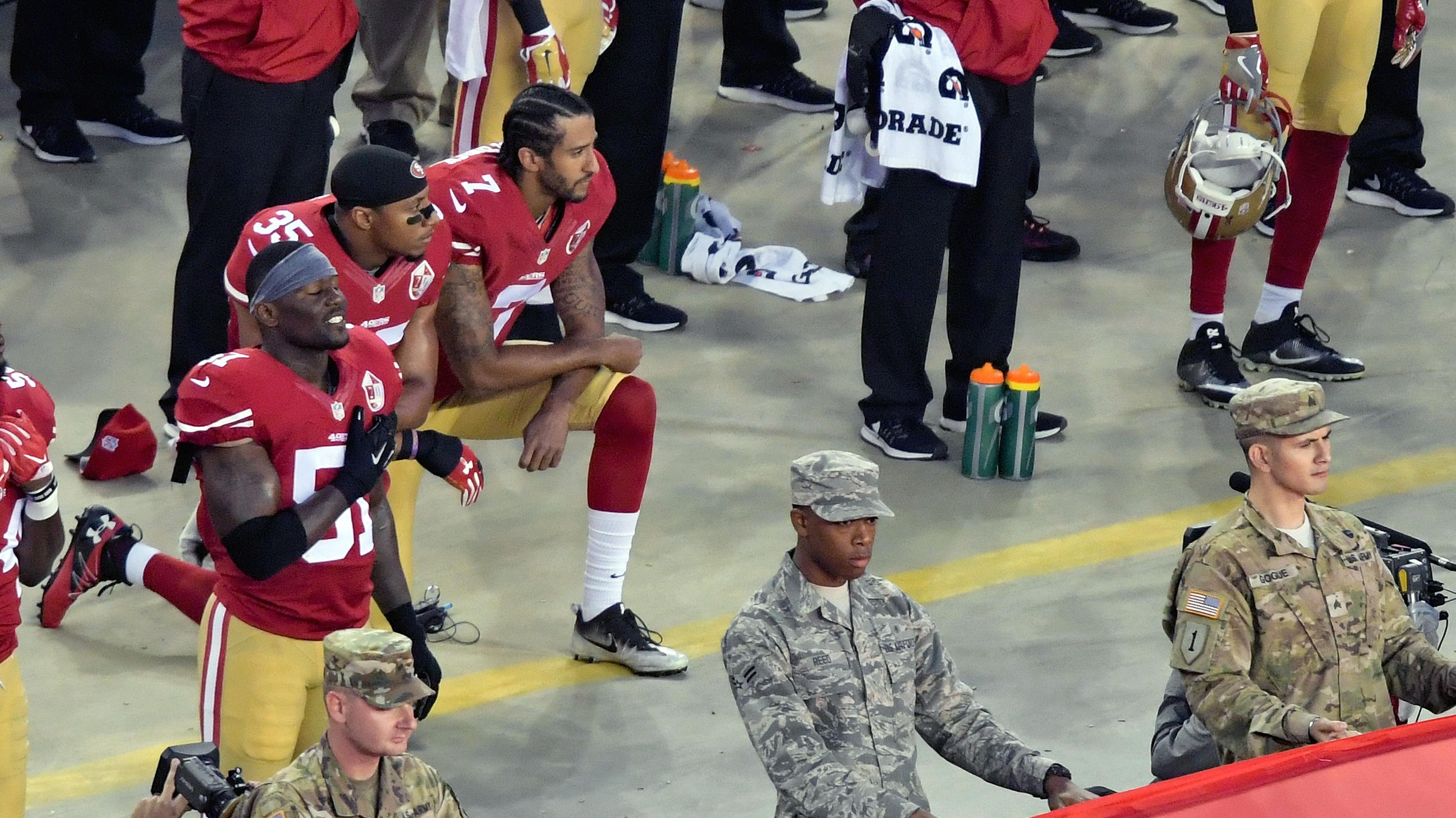 Her blev han siddende under hele nationalsangen for at demonstrere sin utilfredshed med racemæssig ulighed i samfundet og politivold over for sorte i USA.