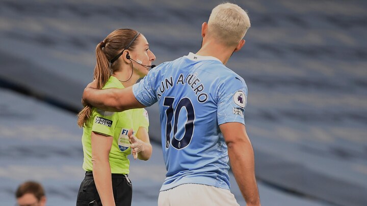 For da Sian Massey-Ellis kort før pausen dømte indkast til Arsenal, gav Sergio Agüero udryk for, at han var uenig i den vurdering.