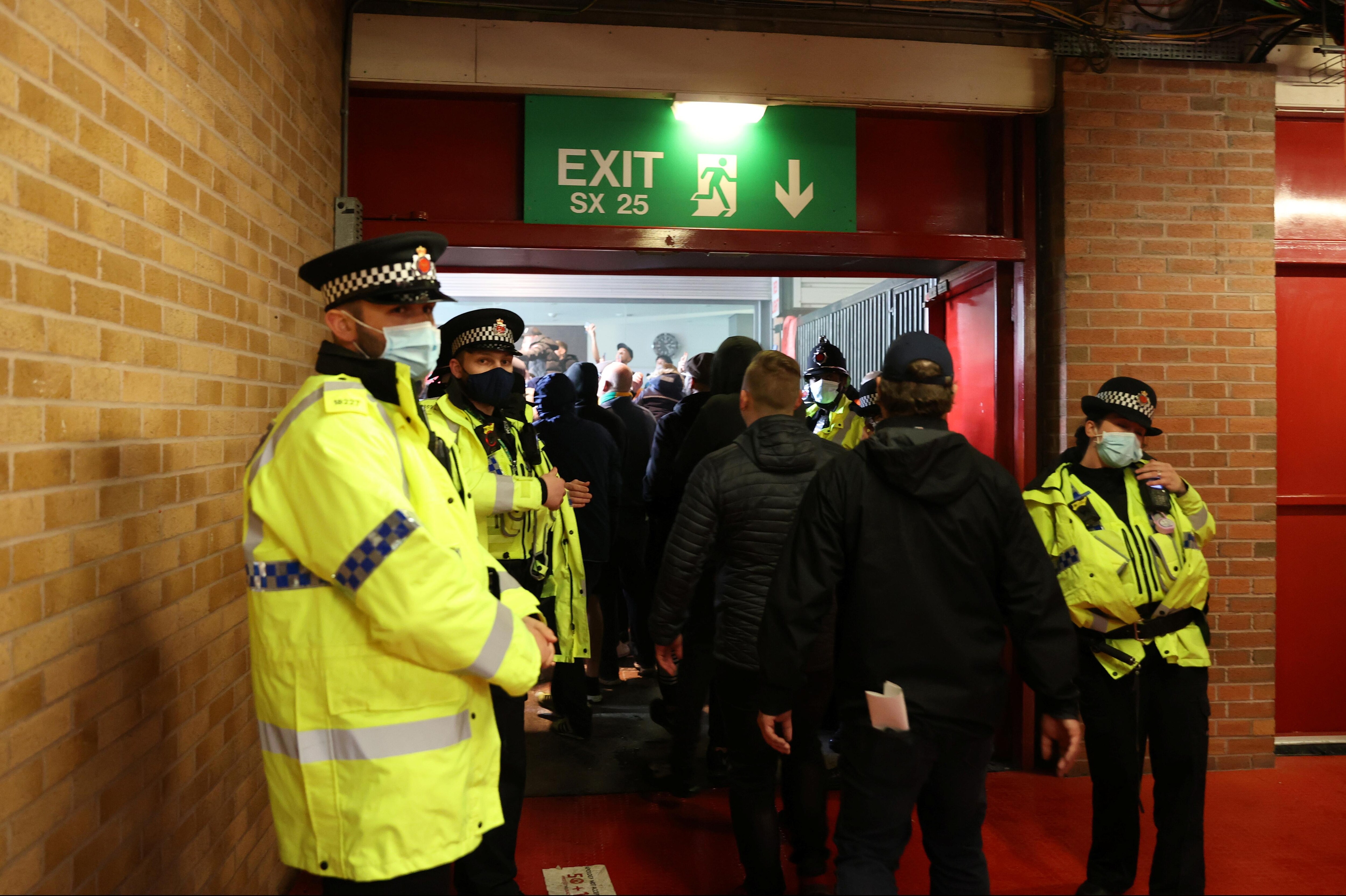Politiet i Manchester oplyste mandag, at to betjente var kommet til skade under protesterne, hvor der blandt andet blev kastet med romerlys. Urolighederne var skyld i, at kampen mellem Manchester United og Liverpool, som skulle være spillet søndag eftermiddag, blev udsat.
