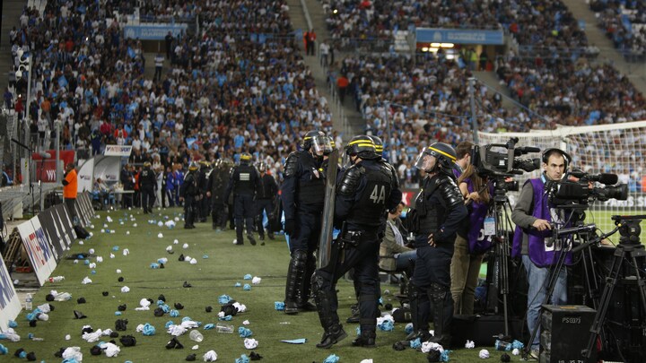Kampen på Stade Velodrome i Marseille blev undervejs afbrudt i 20 minutter, efter at tilskuere begyndte at smide flasker og andre genstande ind på banen.