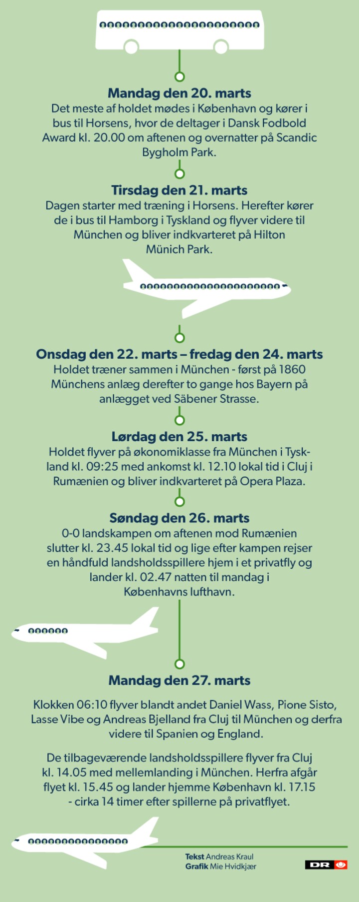 Det specielle ved hjemrejsen fra VM-kvalifikationskampen i Cluj var imidlertid, at den blev taget af en lille gruppe spillere, og at den så åbenlyst gik imod DBU-toppen, der specifikt havde valgt ikke at chartre en maskine til hjemrejsen, men altså i stedet valgt rutefly.