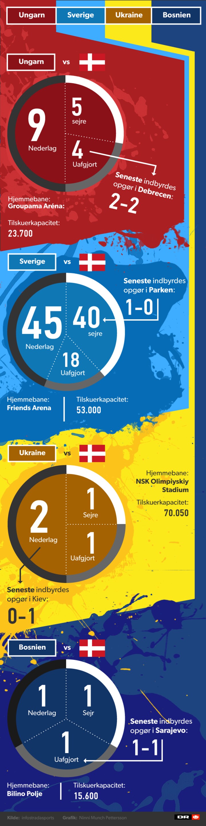 Helt anderledes ser det ud for Danmark fire mulige modstandere. Men lad os først tage et kig på de indbyrdes opgør i grafikken herunder.