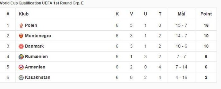 Danmark på tredjepladsen er seks point efter etteren Polen og har samme pointtal som Montenegro på andenpladsen med 10 point. Kun de bedste otte toere skal spille play off, og også i dette regnskab ser det sort ud for det hold, der bliver nummer to i Danmarks gruppe.