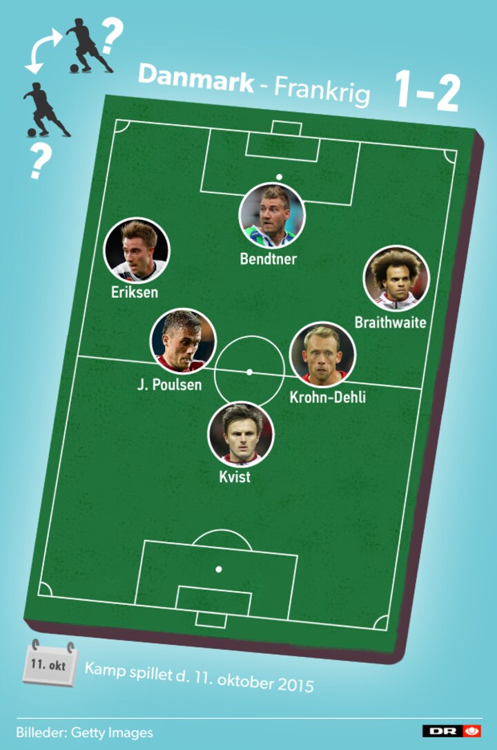Nicklas Bendtner 00 En enkelt afslutning lige på den franske målmand blev det til for Bendtner i 1. halvleg, men derudover var angriberen uskarp og kunne slet ikke udfordre de bomstærke franske stoppere. Flere dårlige førsteberøringer i feltet.