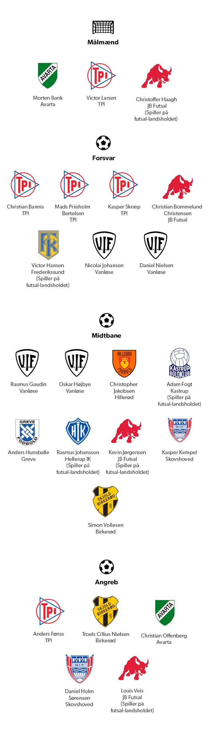 Dermed er fynske Tarup-Paarup (TPI) og Vanløse fra 2. division de største leverandører til landsholdet. Fire spillere fra hver klub har sagt ja til DBU's tilbud. Derudover er der seks spillere på holdet, der også indgår på det danske landshold i futsal.