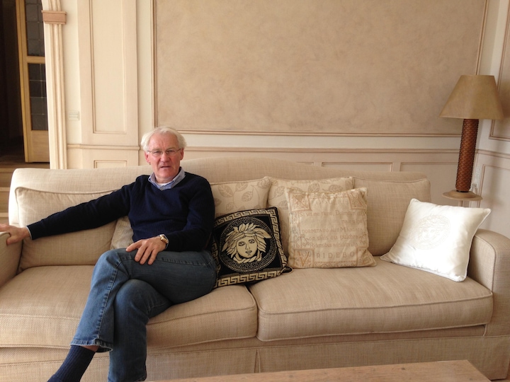Han fortæller, at han skal have fundet en person, der vil køre hans motorcykel til Belgien, han fortæller, at han ikke har fløjet mellem København og Bruxelles siden terrorangrebet på den belgiske lufthavn for et år siden, og han peger på væggen, hvor der hænger et maleri af hans hus i Belgien.