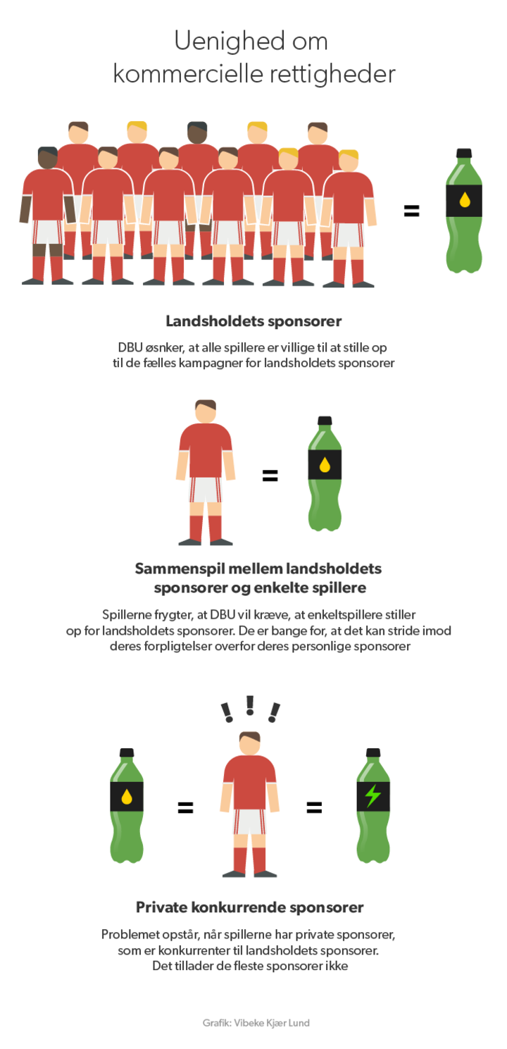 Vi ved dog, at netop spørgsmålet omkring brugen af landsholdsspillere til reklamer og spillernes muligheder for selv at indgå i personlige sponsorater er et af de væsentlige stridspunkter. DBU ønsker i højere grad at kunne garantere deres sponsorer, hvilke spillere, der står til rådighed i reklamer.