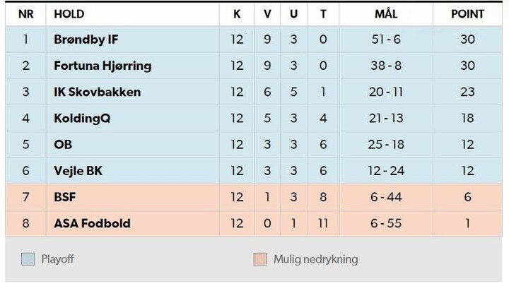 Som man kan se på stillingen herunder, så har topholdene Brøndby og Fortuna stadig mulighed for at gennemføre grundspillet uden at tabe en eneste kamp. De to hold skal ikke møde hinanden i de sidste to spillerunder.