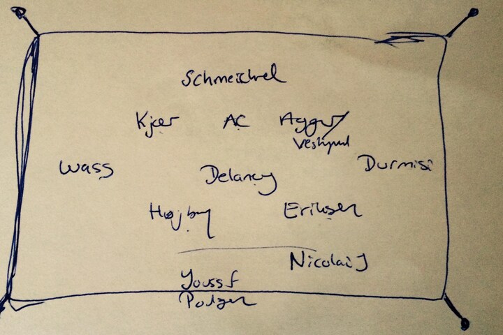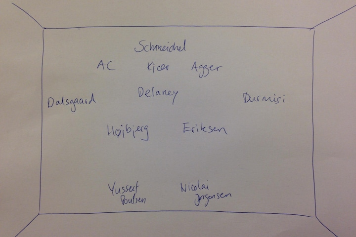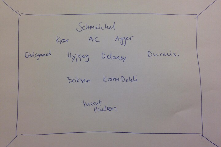 Målmand: Kasper Schmeichel Centerback (højre): Simon Kjær Centerback (midt): Andreas Christensen Centerback (venstre): Daniel Agger Wingback (højre): Daniel Wass Wingback (venstre): Riza Durmisi Defensiv midt: Thomas Delaney Central midt: Pierre-Emile Højbjerg Central midt: Christian Eriksen Angreb: Yussuf Poulsen Angreb: Nicolai Jørgensen