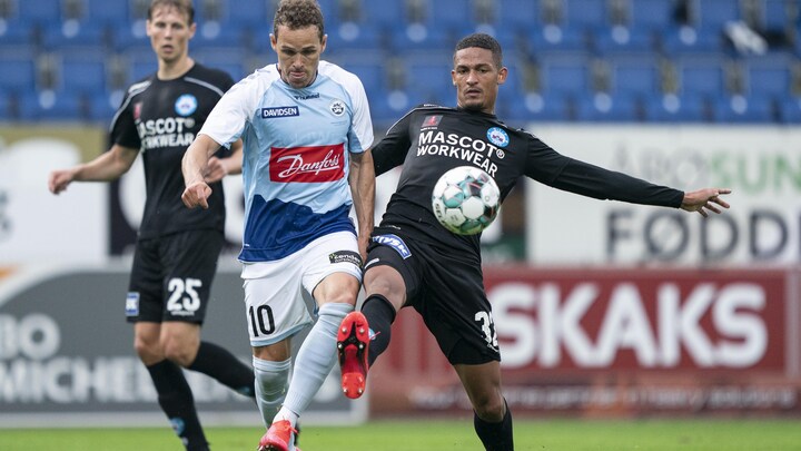 Anders K. Jacobsen (Sønderjyske - 10) mod Frederik Alves Ibsen (Silkeborg - 32). 3F Superliga: SønderjyskE - Silkeborg IF - Sydbank Park Haderslev. Lørdag den 27 juni 2020.. (Foto: Claus Fisker/Ritzau Scanpix) (Foto: © Claus Fisker, Scanpix)