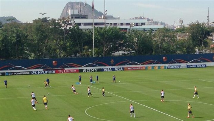 Først en omgang let opvarmning efterfulgt af et par småøvelser, og så tre kvarters højintenst spil til to mål på en forkortet bane, hvorfra der er frit udsyn til en mand, som lige akkurat slår Zico i popularitet her i byen, nemlig kristusfiguren på toppen af Corcovado-bjerget.