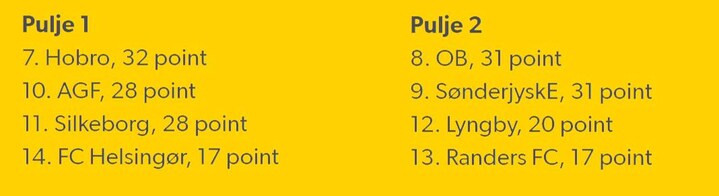 Det gælder om at slutte som et af de to øverste hold i hver pulje, og som det fremgår ovenfor er pulje 2 derfor klart mest attraktiv. OB og SønderjyskE har 11 points afstand ned til Lyngby inden puljespillet, mens de tre øverste hold i den anden pulje ligger inden for ganske få point.