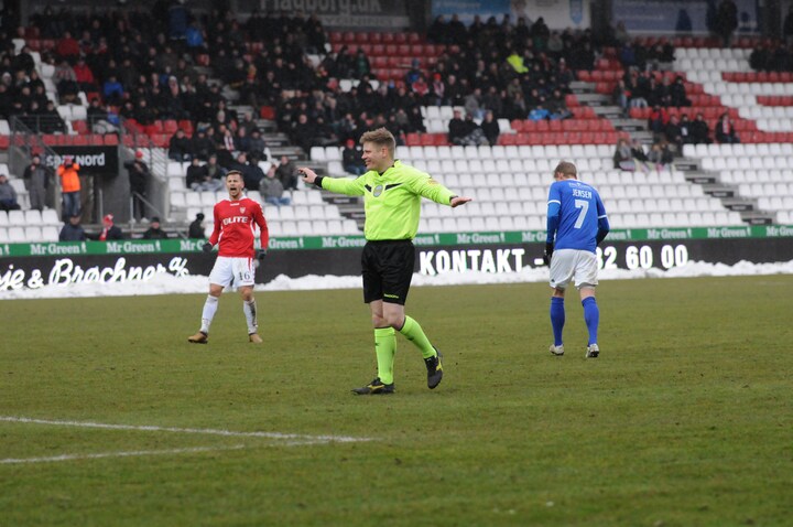 Jakob Sundberg fløjter 1. divisionskampen mellem Vejle Boldklub og Fremad Amager af efter seks tillægsminutter. I takt med de to linjedommere og fjerdedommeren bevæger han sig ind mod banens midtercirkel for at møde de to klubbers spiller- og trænerstab til et håndtryk som tak for kampen.